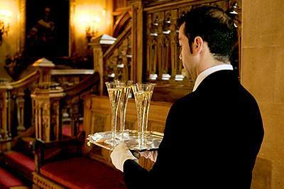 As the sun softens over the gardens, you will be invited into the Castle to enjoy a glass of Highclere Castle Champagne or a non-alcoholic alternative, and delicious canapés before touring the iconic State Rooms and Gallery Bedrooms.